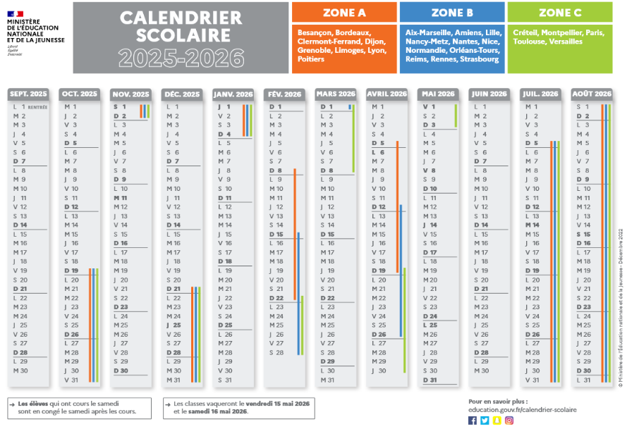 Vous pouvez consulter les calendriers sur : education.gouv.fr/calendrier-scolaire.